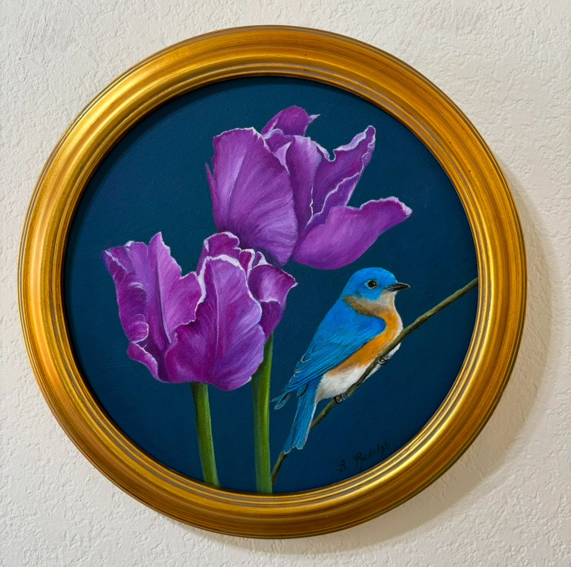 A little bluebird sitting among the tulips. This painting is 12″ round and comes custom framed. Overall framed size = 14″ x 14″